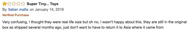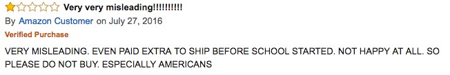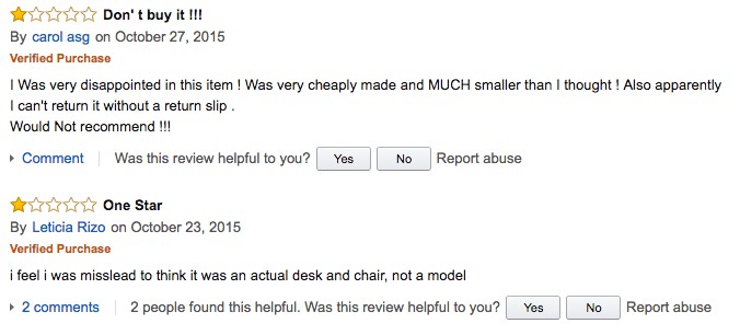 結果超多人等到收到實品才驚覺上當受騙了,因為這個看似正常尺寸的桌椅,其實才只有22公分高、18公分長、4公分寬的迷你size。想當然這些覺得被騙的買家就到商品網站給一堆負評啦!一位推特網友Paul看了這些好笑的評語,忍不住來分享給更多人笑一下囉~「超級照騙!!我還特別多付錢,讓我可以在開學前拿到。超級不爽的,所以各位千萬不要買,尤其是美國人。」