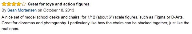 不過其實在敘述商品那一欄中,有寫道「15公分的模型配件」,意指這些桌椅是特別設計給模型人偶使用的啦!所以還是有其他買家留下正評「五顆星。給模型公仔用剛剛好!」