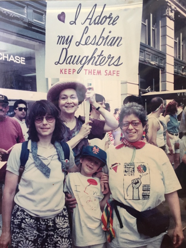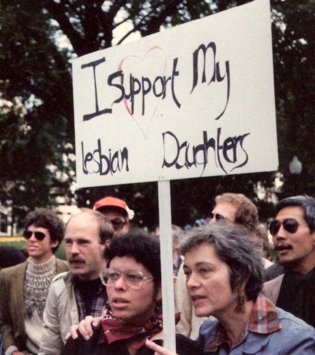 在這張黑白照片裡,一位戴著帽子的女生舉著「我愛我的蕾絲邊女兒們,請讓她們平安。」的告示板,這樣的畫面其實不只出現過一次,事實上這位媽媽到現在還是會舉著相同的板子參加遊行!
