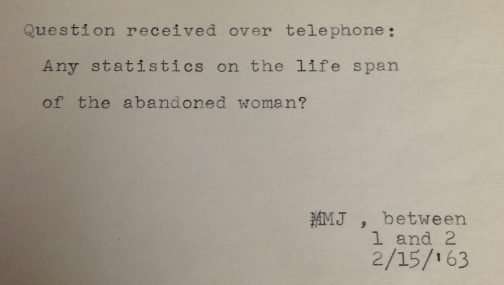 5. 在1960年间纽约公共图书馆提供一组电话让民众打电话来询问问题,每天都会派10几个人来回答大家的疑问,而下图则是有人询问过问题的之一,不过却找不到答案…(有没有被抛弃女子的寿命的任何数据?)