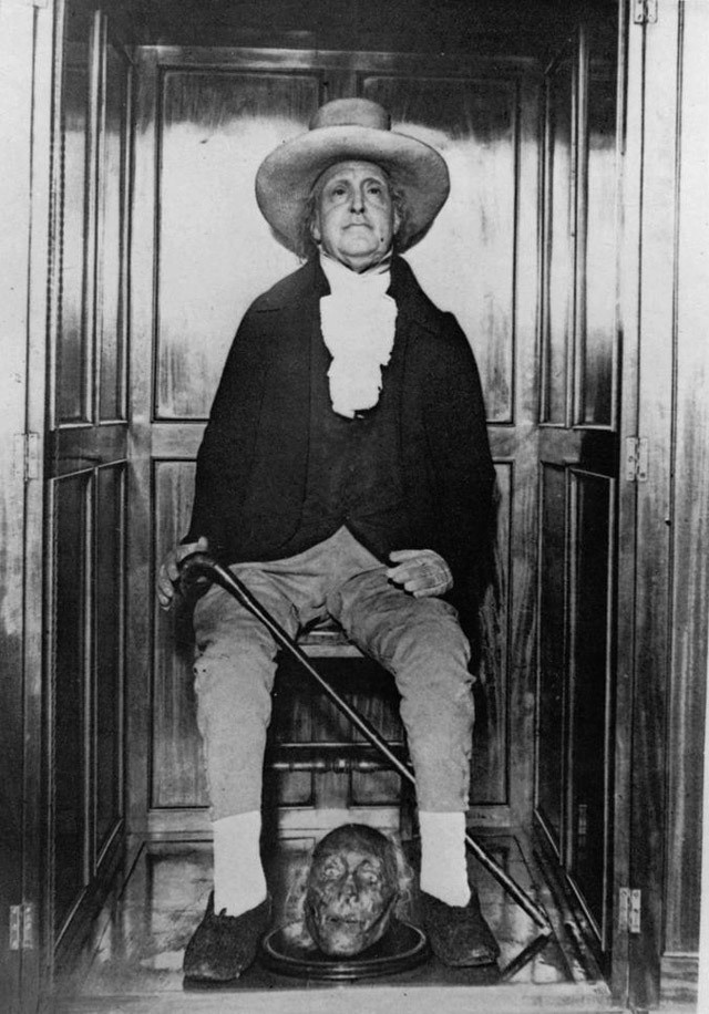 16. Jeremy Bentham一直很希望死后可以被做成标本,不过很可惜的师傅没把他的头做好,所以只好做了一个复制品放在他的脖子上,而他真正的头在躺在他的两腿之间…