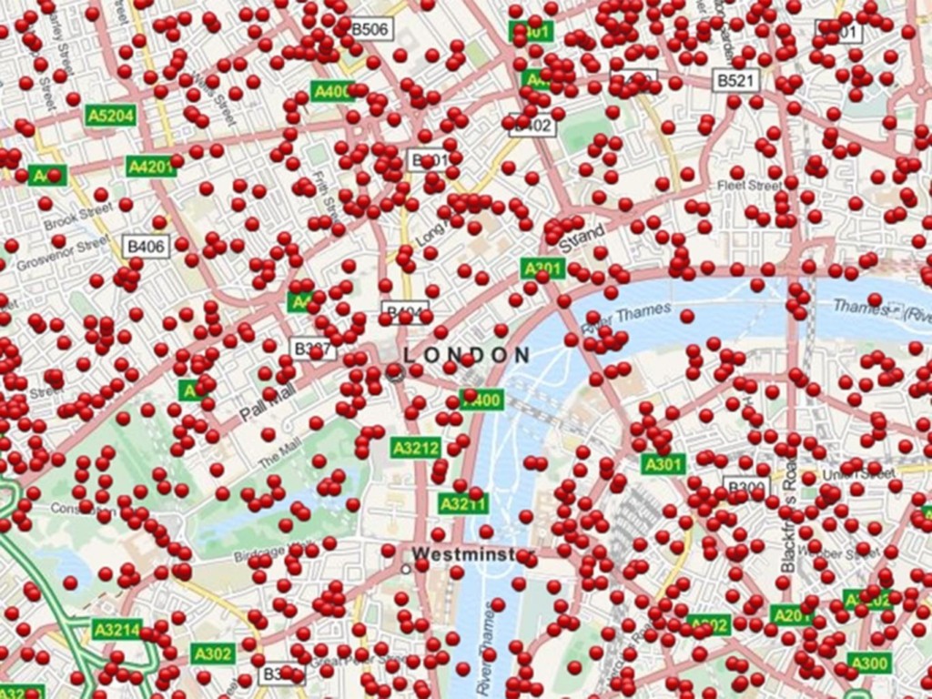 3. 这张图可不是记录了你到过哪里,而是在1940年10月7日到1941年6月6日期间,纳粹放了多少炸弹在伦敦,这些炸弹总共夺取将近4万3千个人命。