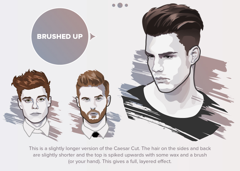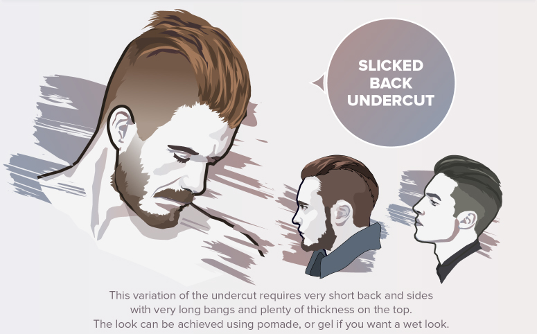 這類的髮型有著極長的旁分瀏海,上方也要足夠的髮量,而後方則極短,並且需要用髮蠟或是髮膠來完成這樣的造型。