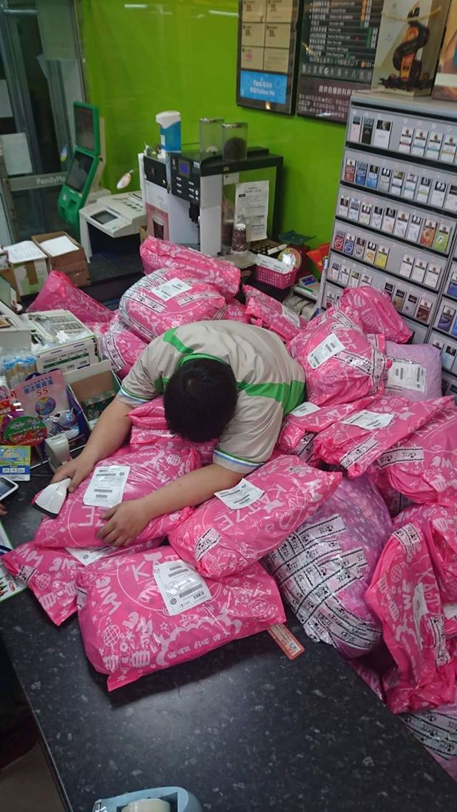 照片中的櫃台和男店員被一大堆網購包裹淹沒,而他似乎清點到幾乎崩潰,累到倒在包裹堆上。原PO表示:「我真心覺得,台灣人的購物慾望跟能力真的是世界數一數二的強….我都被賣家要出的貨淹沒在櫃臺了啊啊啊啊….在此為同樣要收很多EC的店家加油…」