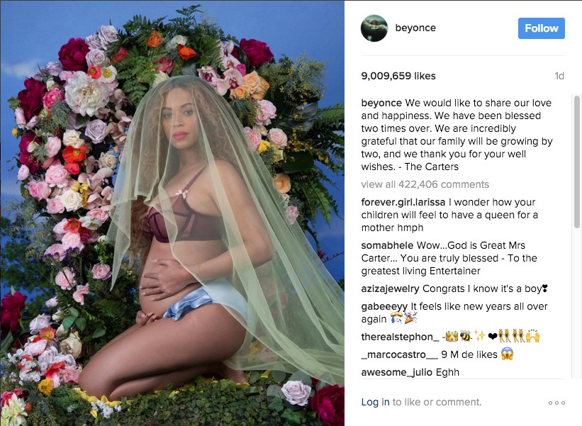 美國歌壇天后碧昂絲,近日公布出自己已經懷上了雙胞胎的消息!她說:「我們想要分享一下我們的愛與快樂,我們非常開心與期待這個家將要新增2位新成員,我們也謝謝你們對我們的祝福。」消息一出,竟然已經達到9百萬個讚 (打敗賽琳娜的630萬個讚),不虧是天后級的人啊!