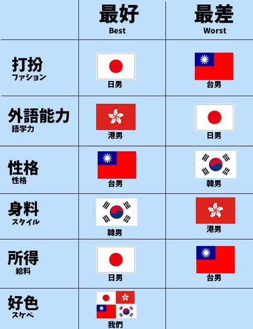 网友表示:「但我觉得港男身料还可以啊」、「给料最好是日男?」、「性格我觉得是港」、「台男个性最好!」、「好色 我们 哈哈哈」、「GG 最好就好 其余都不重要」、「最差应该全部都是台男吧」、「中肯」、「有史以来,最中肯!」、「打扮跟所得成正比啊…」、「最后一项最正确的」、「其实最下层才是重点吧」、「色色可以拯救世界」等。