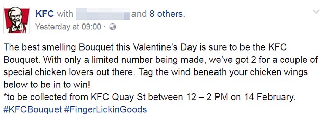 肯德基表示「在这个情人节里,香味最棒的一束花,就是肯德基的鸡米花!由于数量有限,只有20位幸运的情侣可以得到这束特别的花!」但很可惜只有在纽西兰才有! (太可惜啦!) 网友们竟然回应了?!