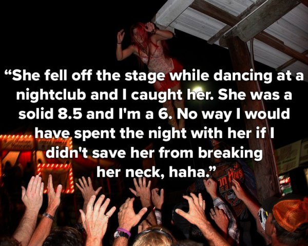 7.「她在夜店台上跳舞時跌倒,我從下面接住了她。她身高174,我只有167。要是我沒有在她摔.斷脖子前救她一命,我們根本不可能有機會共度一晚,哈哈。」