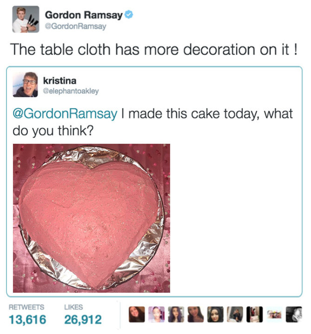 21. 网友:「嗨你觉得我做的蛋糕如何?谢谢」高登:「它被你摔过吗?」