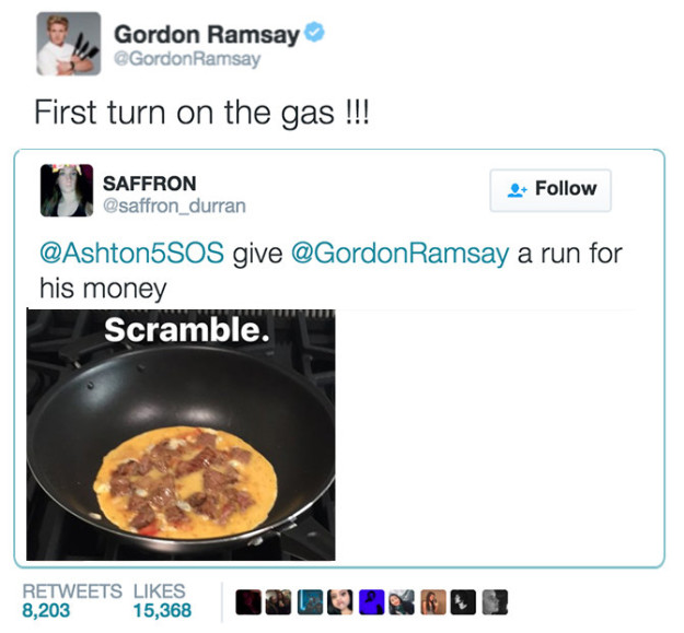 16. 网友:「高登,我为了告诉你我是个比你厉害的厨师,我还真的跟随你了。」高登:「这就是为何你的炒蛋看起来像一盘橡胶子弹。」