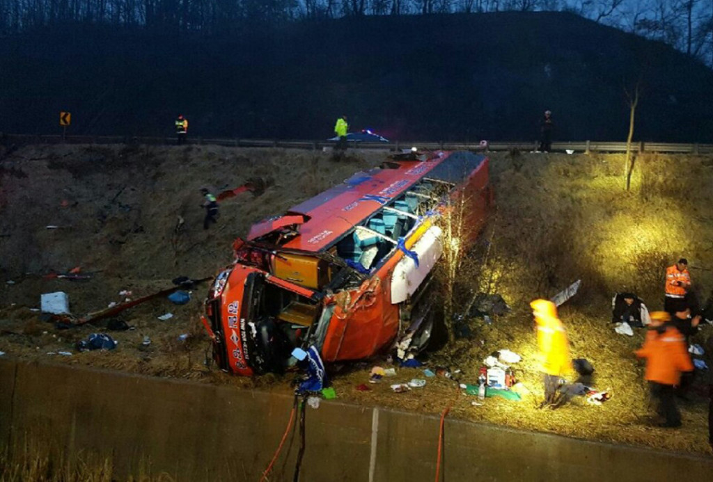 该游览车是在韩国忠清北道丹阳郡翻覆,车上载的是金乌工科大学要去新生训练的学生。车上44人仅62岁的李姓司机重伤,送医后不治。所有学生都因为有系安全带,车体也无明显变形而而平安生还,多数只受轻伤。