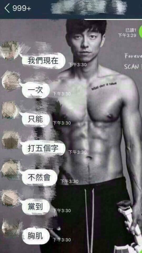 Line是普遍会被用到的聊天软体,而且还可以用自己想要的照片当背景!只是这个功能竟然变成了最搞笑的事情!一名网友在脸书粉丝团「爆废公社」发文表示「我们现在ㄧ次只能打五个字…」一看这个对话记录,原因让人差点傻眼!尽然是因为「胸肌会被挡到」…
