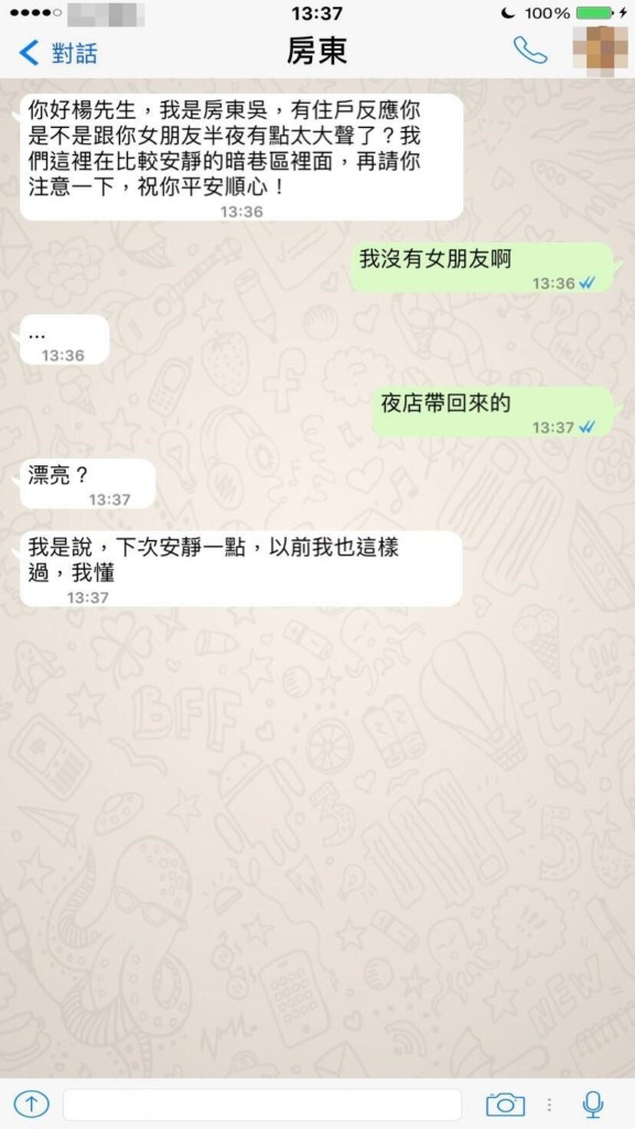 之前有报导过在外租屋最怕碰到的就是隔壁邻居太吵,尤其是当听到让人尴尬的「大声叫床」时,更是让人无法应付。有网友就在脸书粉丝团「爆废公社」分享表示一名房东跟房客的爆笑对话!其中可以看到房东表示「有住户反应你是不是跟你女朋友半夜有点太大声了?我们这里在比较安静的暗巷区里面,再请你注意一下,祝你平安顺心!」而当房客回答说自己没有女友,这是夜店带回来的女生时,房东的第一反应竟然是「漂亮?」让网友喷笑!