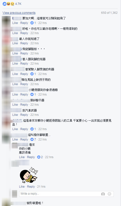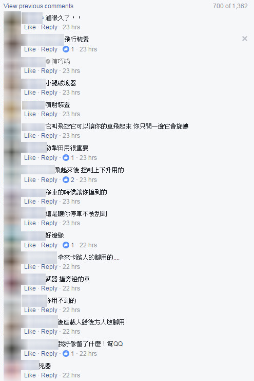 網友看到表示:「滷很久了…」、「飛行裝置」、「小腿破壞器」、「它可以讓你的車飛起來,要小心,只開一邊會讓車旋轉」、「移車時,讓你撞到的」、「武器,撞旁邊的車子用的」、「我好像懂了什麼…」、「傾斜警示器」、「拿來攻擊你小腿脛骨跟路人用的工具,千萬小心,一出來必須見到血!」、「你的小腿應該很痛…」、「怎麼感覺很心酸的問題」、「首先要先有人可以載才會懂」、「車速到達100踢開它就會起飛!」、「因為後面沒有載過人,才不知道」、「不要聽上面的人亂說,是為了在高速時提昇下壓用的」、「單身」、「用來飛的,但記得要抓緊龍頭,因為會有亂流」、「開瓶用的」、「風切用的,降低風阻。」等。