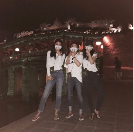 圖片中站在中間的她,很有默契地跟雪炫和智敏同樣穿著白T、緊身牛仔長褲和夾腳拖鞋。可以看到她的腿非常地細,差點認不出她來!