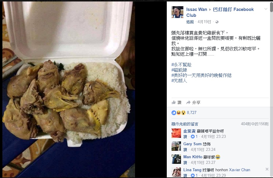 而這是原PO的貴妃雞飯,整個便當內有9個雞頭,外加1個雞屁股,這也讓他自嘲「美好的一天用美好的晚餐作結」,而網友們則是笑說「老闆將最好吃的部分都給你了」、「冤有頭,債有主,這盒飯陰氣好重」、「無良的老闆」、「根本賺到」。