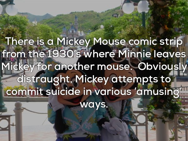 18.「1930年代有一則漫畫描繪米妮離開米奇去跟別的老鼠在一起了,米奇還難過到嘗試了多種『可笑』的自殺方式。」