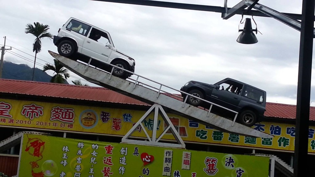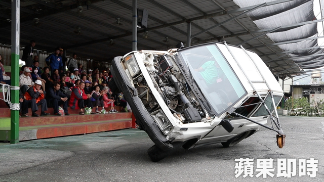他的招牌節目「高空雙車翹翹板」:2台吉普車開上4層樓高的翹翹板,面對面快速前進後退挑戰平衡,驚險剌激的表演讓現場觀眾驚呼連連!