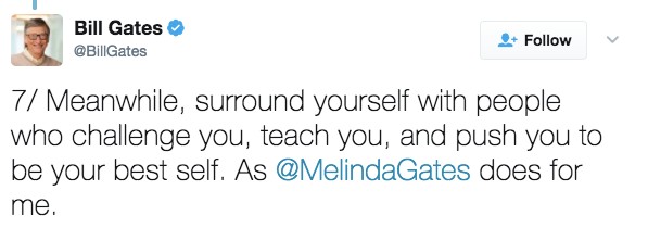 7.「同時,多多跟無論是挑戰你、教導你,或是促使你變成最好的自己的人相處,就像是梅琳達‧蓋茲 (Melinda Gates) 對我做的一樣。」