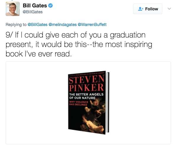 9.「如果我可以給你們一個畢業禮物,那將會是這本書,一本我從沒讀過這麼激勵我的書:知名心理語言學家史迪芬平克的《人性中的善良天使—暴力為什麼會減少》。」