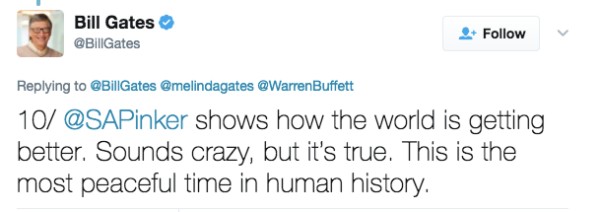 10.「史迪芬·平克 (Steven Pinker) 展現出了如何讓這個世界變得更好。這聽起來有點瘋狂,但它是真實的。這是人類歷史上最和平的時期。」