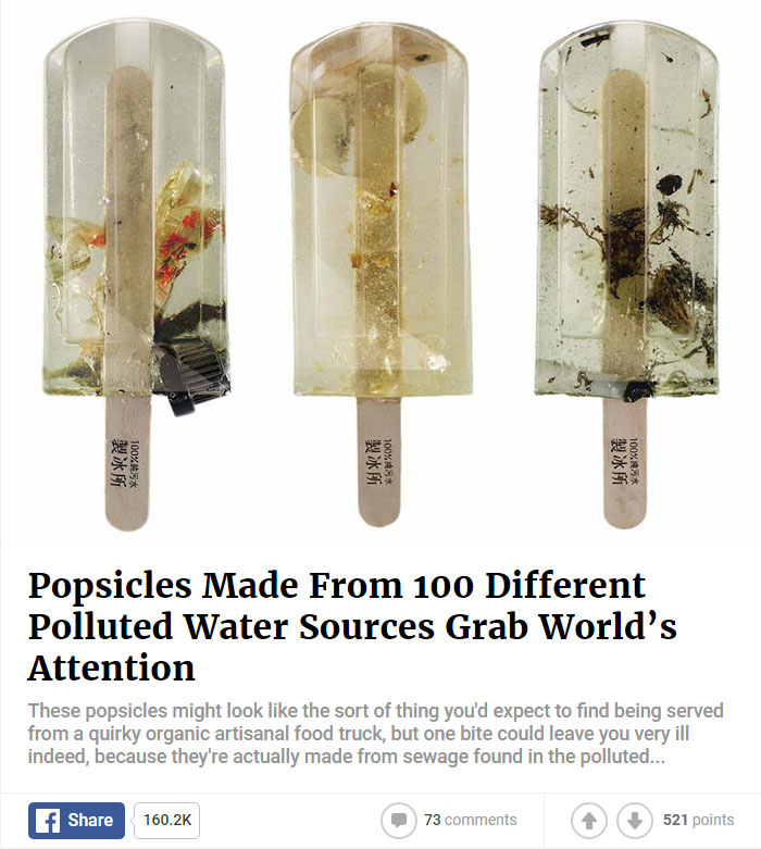 1. 台灣很美,但卻常常遭到破壞,或是水資源被汙染,於是就有3名台藝大視覺傳達設計系的學生洪亦辰、郭怡慧和鄭毓迪,打算以這方面為主題進行探討,他們走遍全台灣100個被汙染的水源地,並且用當地的水做成冰棒,再製作成模型展示,連外包裝都有!希望可以藉此讓大家重視水資源的問題。
