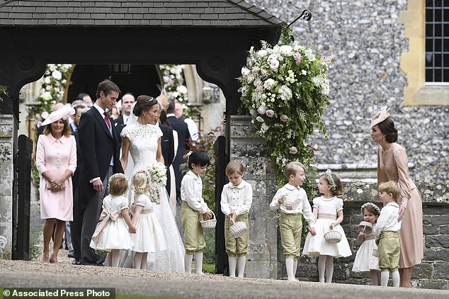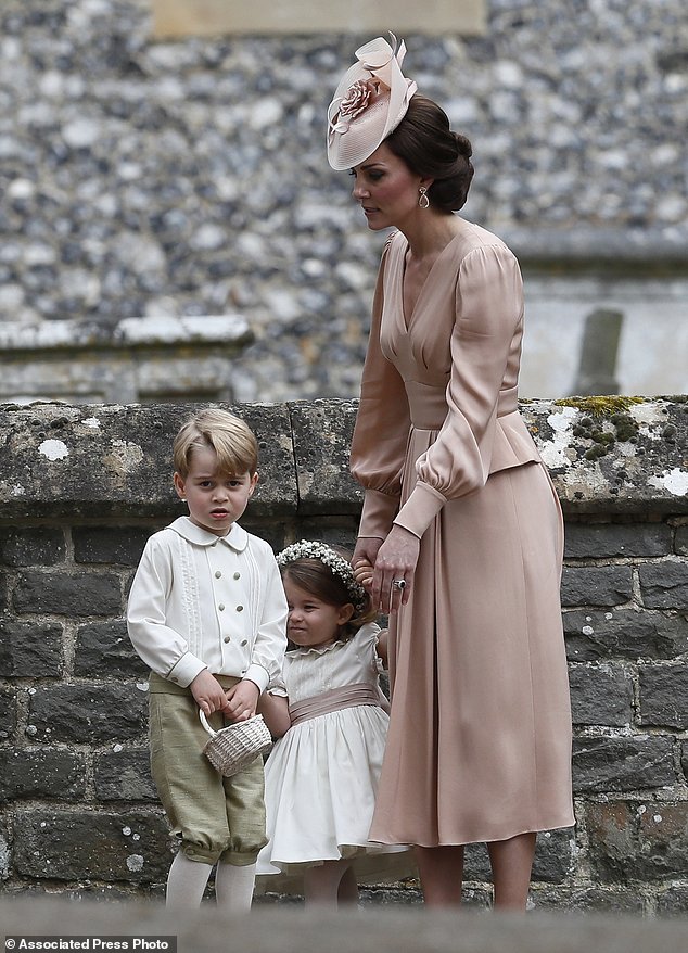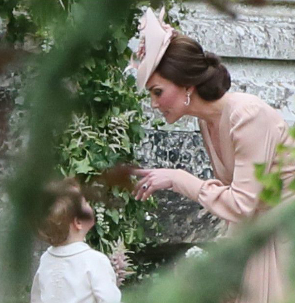 琵琶曾經在2011年時擔任姐姐的伴娘,被外界稱為「最有名的伴娘」,如今也輪到她變成美麗的新娘,只是當新人緩緩步出禮堂時,喬治和夏綠蒂疑似跳到阿姨價值4萬英鎊 (約新台幣155萬) 的婚紗裙襬上,凱特王妃見狀後趕緊上前阻止,並將兒子拉到一旁說話,沒多久就看到喬治哭喪著臉,直到他不哭後媽媽凱特才摸摸他的頭。
