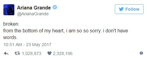 亚莉安娜对爆炸事件表示抱歉,并感到非常心碎。美国官员宣布,当局怀疑自杀式炸弹袭击的嫌犯是Salman Abedi,一名在英国出生的、来自利比亚家庭的男子。