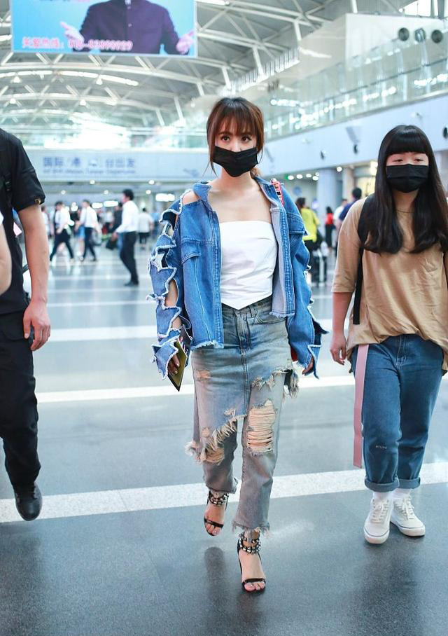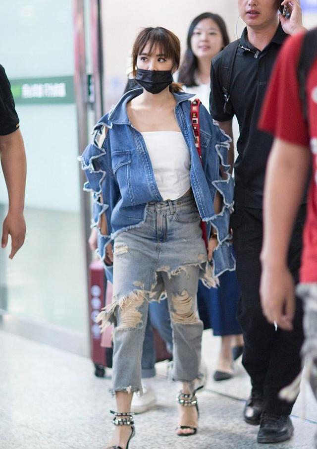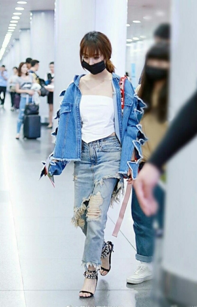 日前蔡依林現身北京機場,但是這次她的機場時尚卻受到大家的討論,只見她裡面穿著一件白色平口的肚兜式小可愛,外面搭著用星星圖案拼接著的牛仔外套,再穿上一條很流行的破洞的牛仔褲,偶爾小露香肩,全身散發出女神的氣場!