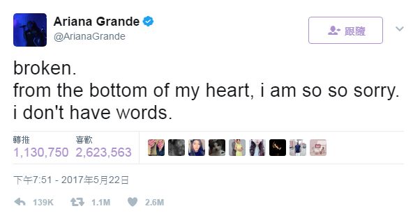 曼徹斯特恐襲造成22死59傷,讓世界各地的人都非常心碎。舉辦是次演唱會的亞莉安娜 (Ariana Grande) 事後在推特上透露自責和哀傷,「心碎。打從我的心底,我真的很抱歉。無言以對。」