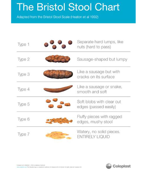 第1型大便呈現的是一顆顆硬球 (很難排出);第2型是表面帶有凹凸的香腸狀;第3型是表面帶有裂痕的香腸狀;第4型的外型像香腸或蛇,表面光滑;第5型呈現斷裂且斷邊光滑的柔軟狀態 (很好排出);第6型粗邊且蓬鬆,呈一塊一塊的糊狀;第7型是無固體塊的水狀。
