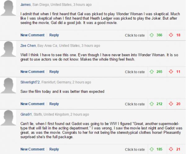 不少网友一开始也跟派蒂有同样的想法,「发现盖儿加朵被选为神力女超人时,我相当怀疑,就如我当时听到希斯莱杰要出演小丑一样,但看过电影后,我觉得她真的演得很好,这是一部好电影」、「我不能否认当时听到盖儿接下神力女超人时,心想『又一位模特儿要来摧毁经典』。但我错了,我看了《神力女超人》后觉得她演得非常棒」。