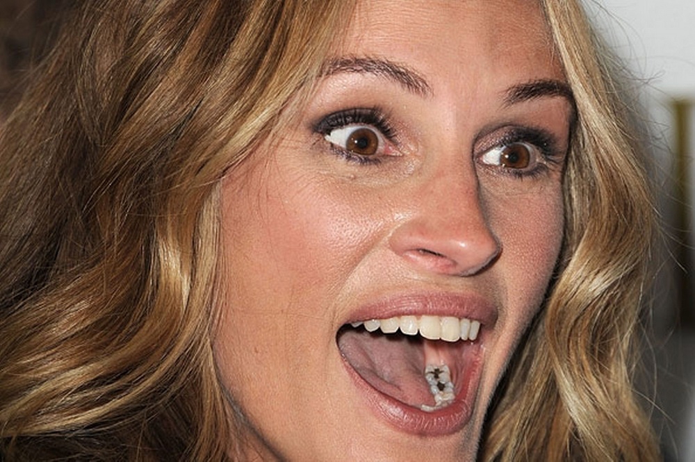 茱莉亚罗勃兹的招牌笑容和洁白的牙齿备受许多观众喜爱,她曾大方分享自己都是靠着用小苏打粉刷牙来美白牙齿。不过虽然她的牙齿从正面看很完美,从别的角度看就露馅了。