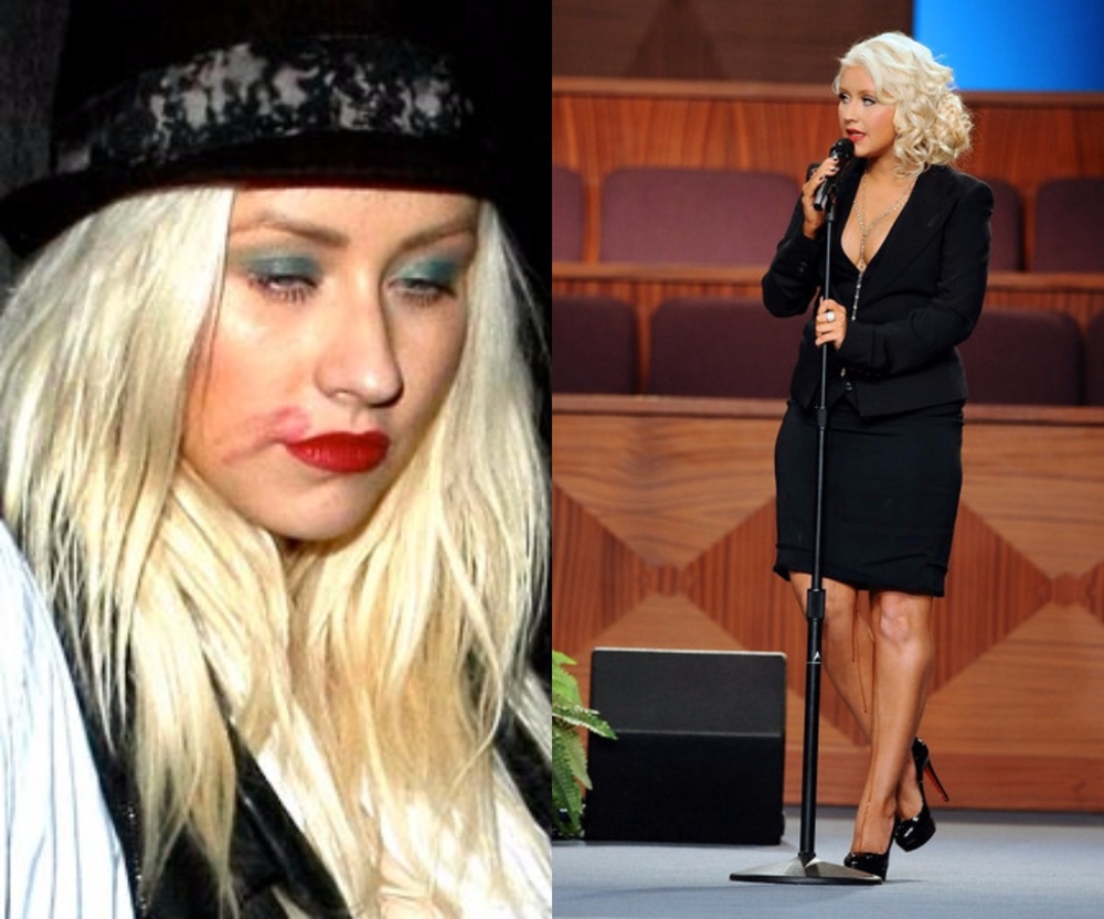 流行天后克莉丝汀曾被拍到口红画歪,2012年出席Etta James的丧礼致词时媒体发现有经血顺着她的腿流下来。