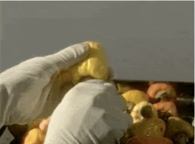 8. 不过还是有些地方会用人工手动剥皮,那真的很耗费时间。而且腰果的皮当中有汁液,会腐蚀人的皮肤,所以作业时需戴防护手套,但长久下来还是会伤到皮肤。