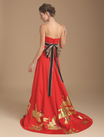5. 金鹤:这件礼服使用了大红色和金色的鹤,整体看起来非常大胆且豪华,而黑色雪纺纱的搭配则是增添了一些优雅的感觉。