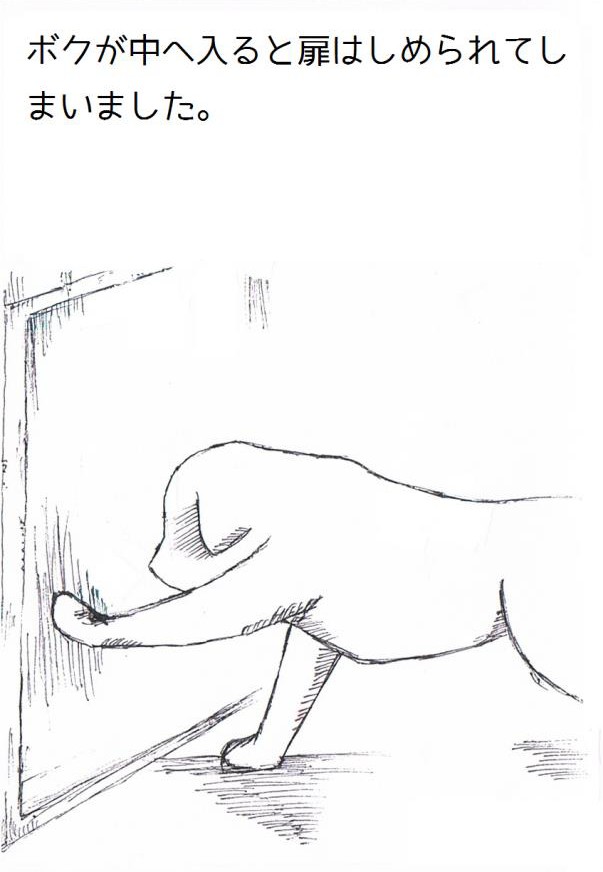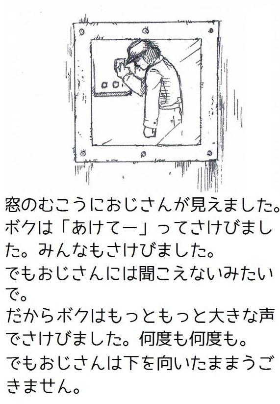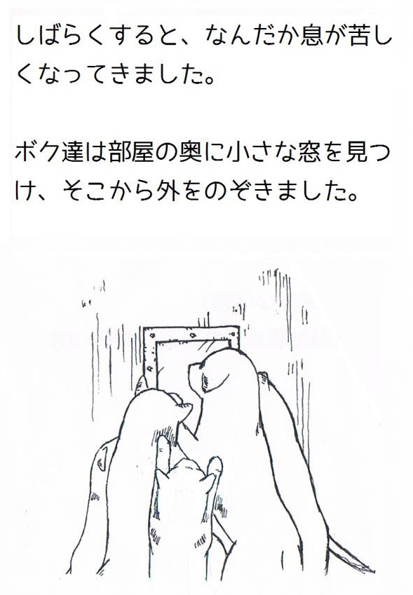 19. 我一進去後,門就被關上了。這和之前住的籠子不一樣,房間的氣氛好怪,還有輕微的震動感。我突然覺得好害怕,但我不管怎麼努力,門都還是關得緊緊的。過了一會,我開始覺得呼吸困難。