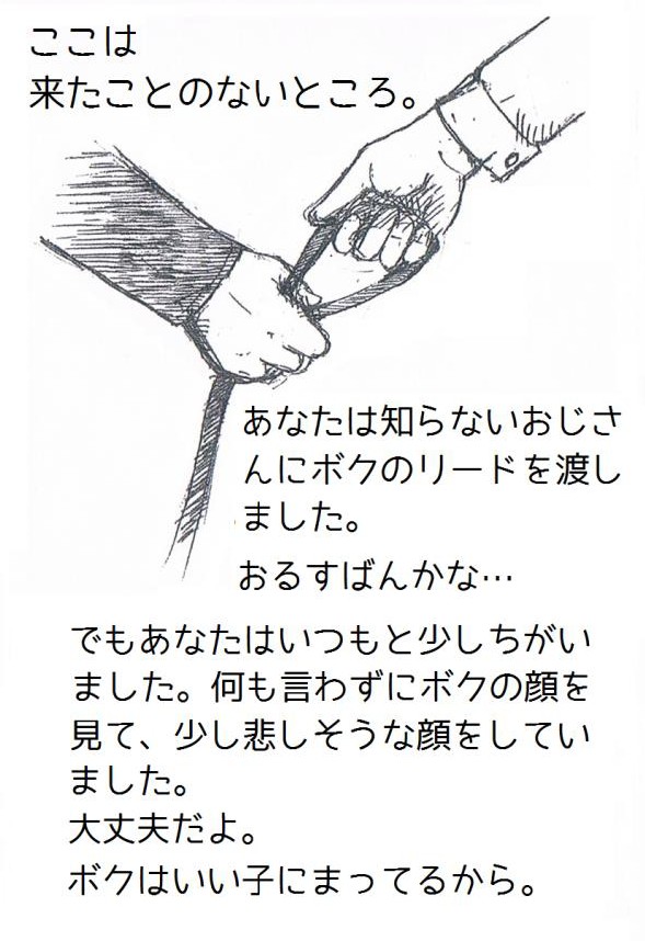 10. 我們到了一個從沒來過的地方,你把項圈交給了一位不認識的叔叔。你沉默地看著我的臉,好像有點悲傷。沒關係,我會乖乖等你的!