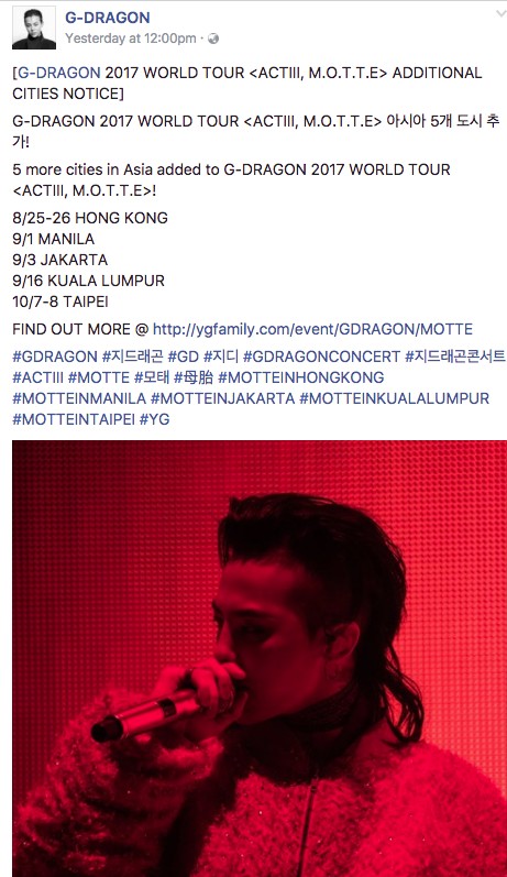而他也在自己的脸书上发布了这个消息,表示G-Dragon 2017 的世界巡回演唱会〈ACTIII, M.O.T.T.E〉 在亚洲加了多5场!