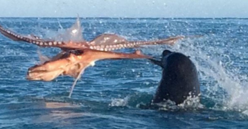 目測海豹重量大約120KG,章魚看起來也是巨型的。誰會贏呢?