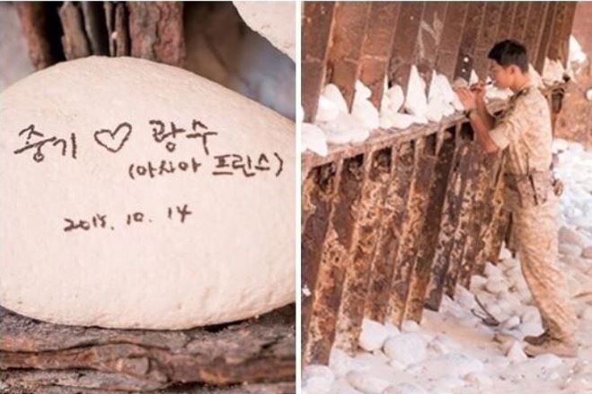 李光洙6日凌晨在IG分享一張宋仲基穿軍服以及「愛的信物」照片,只見石頭上合成寫著「仲基♡光洙 (亞洲王子) 2015.10.14」。該石頭是宋仲基為韓劇《太陽的後裔》遠赴希臘拍攝留下的「愛的信物」,光洙醋勁大發寫道:「這算什麼」讓網友笑翻!