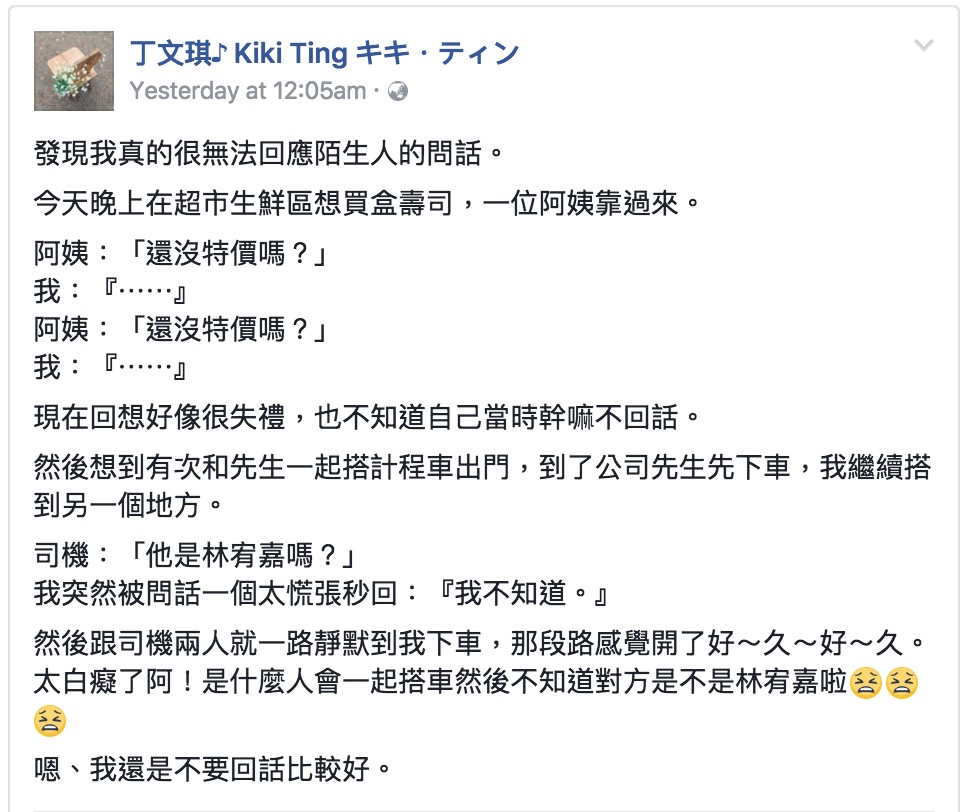 林宥嘉在今年年初成功與愛妻丁文琪註冊結婚,在6月也舉辦了婚宴,不過近日丁文琪在臉書上PO文,表示自己:「真的很無法回應陌生人的問話。」,很多時候都覺得自己好像很失禮,但就是不知道該怎麼回應對方。她在臉書上分享了自己在超市買壽司跟和老公一起搭計程車時的無言狀況!