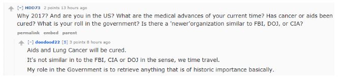 「為何選2017年?你在美國嗎?你那個年代的醫療技術如何?癌症和愛滋病能夠治癒了嗎?你在政府部門是什麼職位?有出現新的組織嗎?類似FBI、DOJ或CIA?」