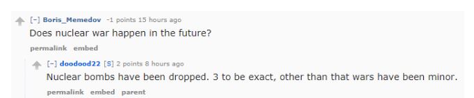 不知道大家相不相信已經有人可以穿越時空這件事?不過,先前就有一位自稱來自未來的網友在Reddit論壇分享了他的時間旅行經驗。還是要說一句啦,信不信由你囉!   網友doodoo22在Reddit的AMA (Ask Me Anything) 自稱自己來自2064年,邀請網友提問未來會發生什麼事,雖然