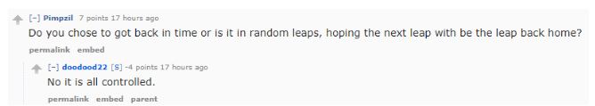 「時間旅行對一般人來說容易嗎?」原PO:「並沒有開放給大眾。對我來說很容易,但對創造它的人來說就不怎麼容易了。」