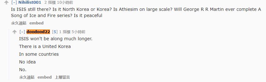 「ISIS還在嗎?南北韓會變怎樣?無神論會是主流嗎?George R R Martin會完成《冰與火之歌》全系列嗎?未來和平嗎?」