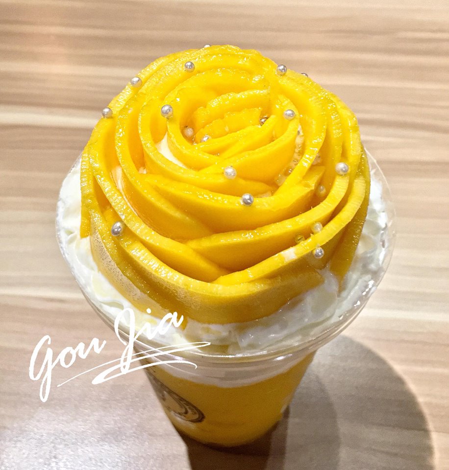 這杯是新推出的叫「芒什麼」,上面的花瓣是用芒果做成的。