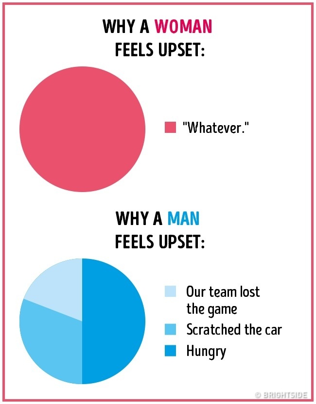 男人不高興的原因:我們的球隊輸了;車被颳了;餓了。