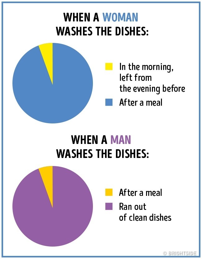 男人洗碗的時機:用完餐後;沒有乾淨的盤子了。