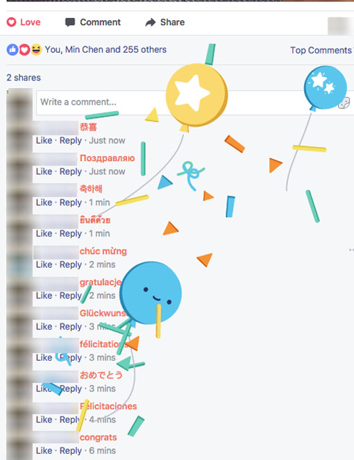 臉書也支持多方語言,以下是小編測試的結果,中文:「恭喜」,英文:「Congrats」,德文 :「Glückwunsch」,法文:「félicitations」,俄語:「Поздравляю」,日文:「おめでとう」,韓文:「축하해」,越語:「chúc mừng」,泰語:「ยินดีด้วย」等等都有用喔!只是要注意這項功能不支援手機聊天App 「FB Messenger」。好啦,快去玩吧!